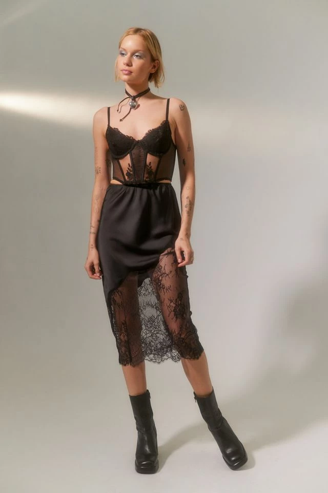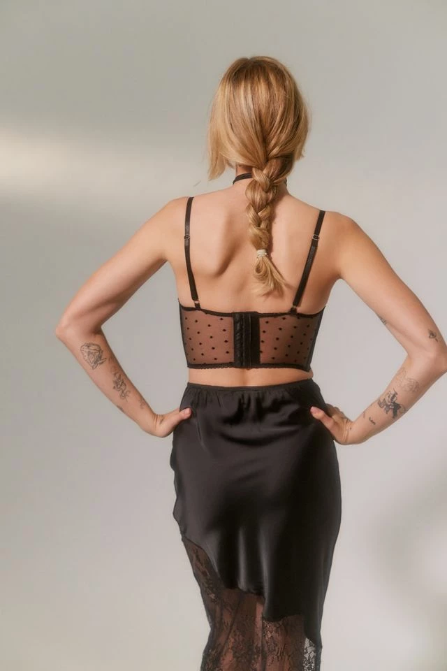 The Nicolette bustier is designed to be seen, with lined underwire cups in scalloped tulle lace and sheer mesh panels with lace detailing throughout – the perfect balance of dainty and sophisticated. Stretch spot mesh back for comfort.