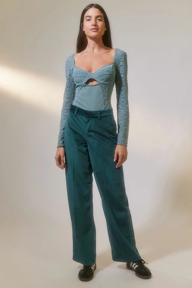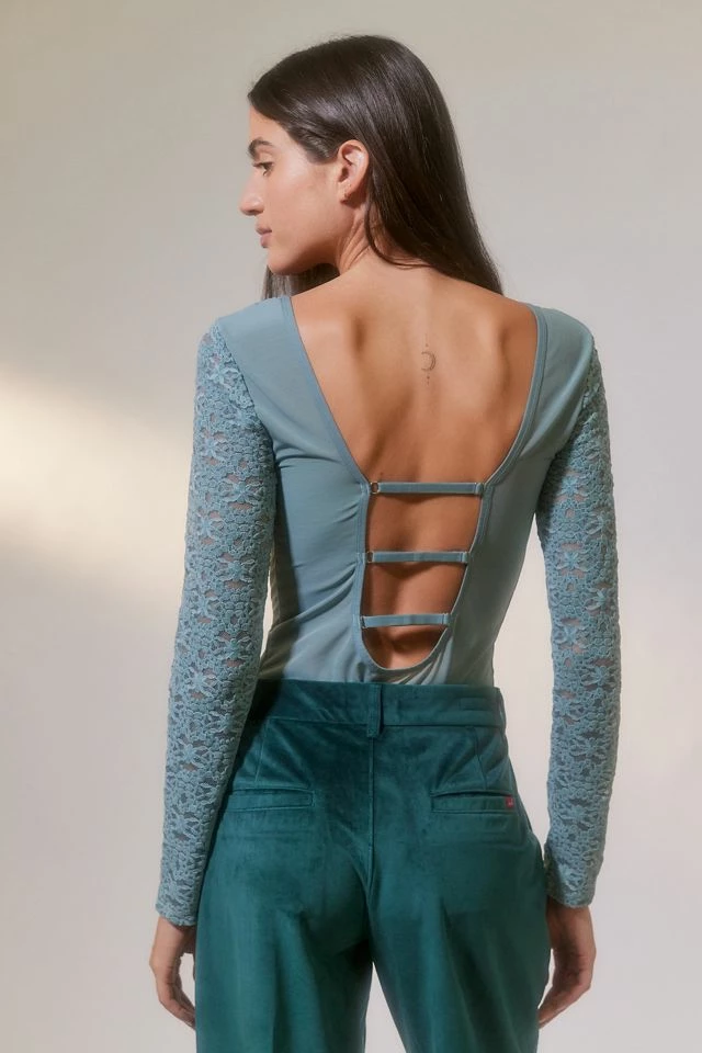 Bodysuit by Out From Under with semi-sheer lace at the sleeves and the bodice. Fitted with a sweetheart neckline plus underwire cups. Finished with strappy detailing at the open back. Only at Urban Outfitters.