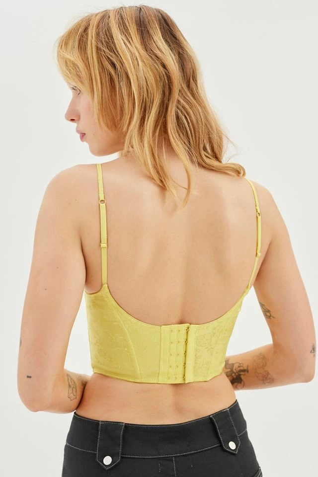 Romantic corset by Out From Under in floral satin jacquard. Cropped silhouette with ruched cups, a bodice with internal boning and a hook & eye closure at the back. Complete with an adjustable tie at the bust. Only at UO.