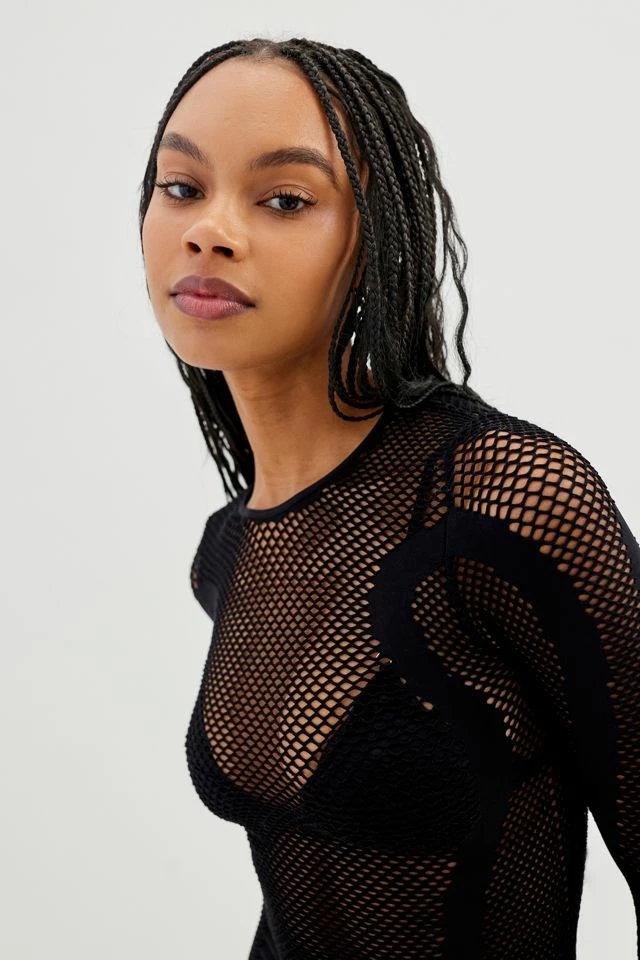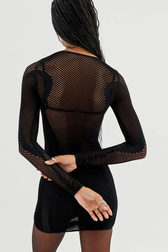 Keep all the attention on you in this Out From Under mini dress crafted from a soft + stretchy semi-sheer mesh knit. Cut short in a bodycon silhouette with a crew neckline and long sleeves. Complete with solid panels throughout. Only available at UO.