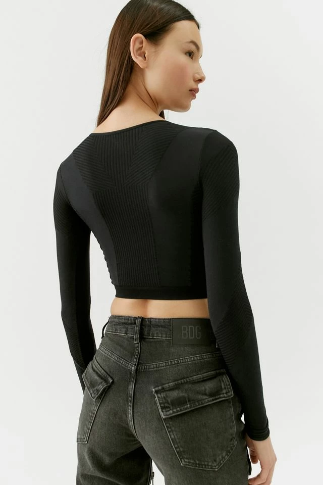 Long sleeve top by Out From Under crafted from a seamless knit that molds to your body. Hits above the waist in a slim-fit with a crew neckline. Complete with ribbed paneling throughout. UO exclusive.