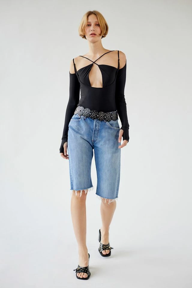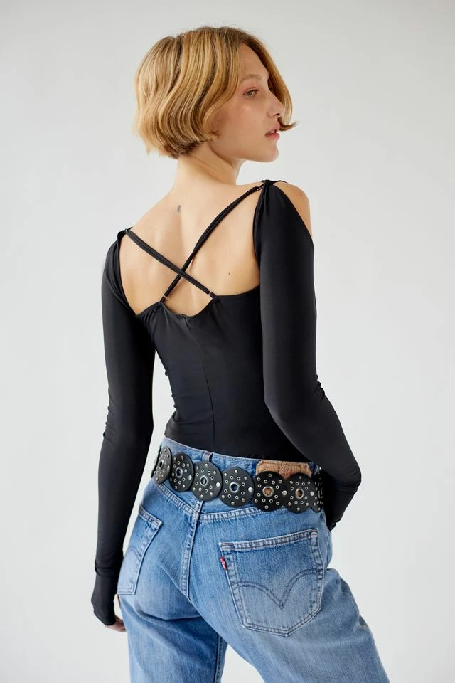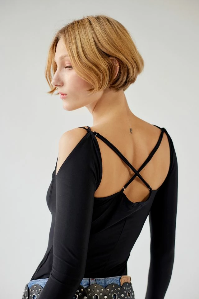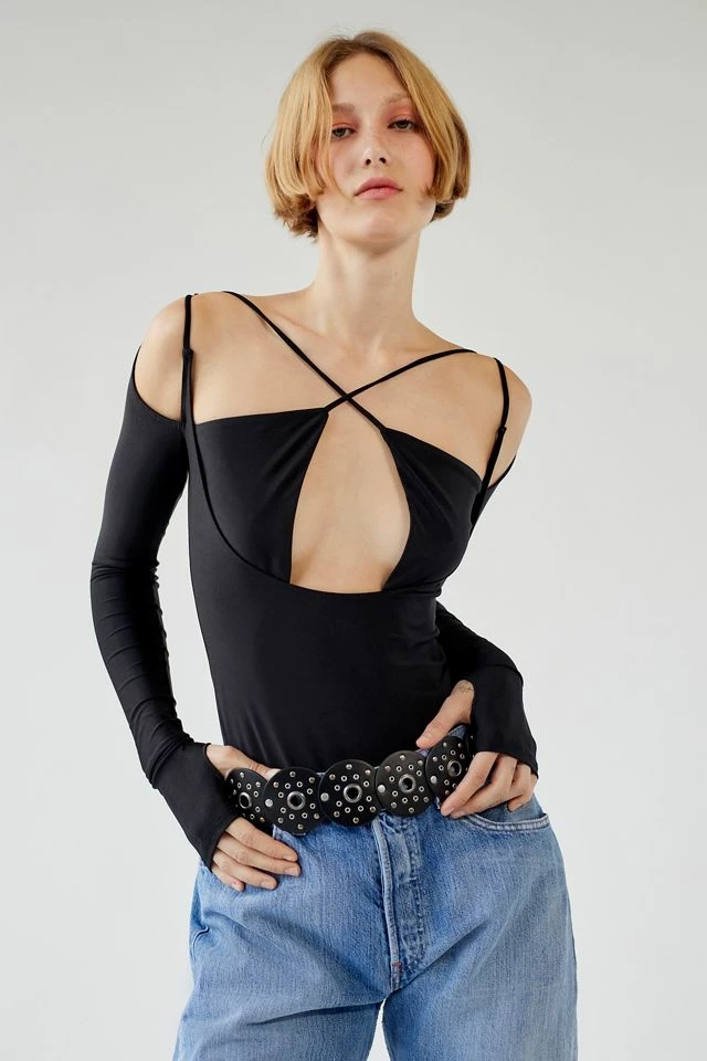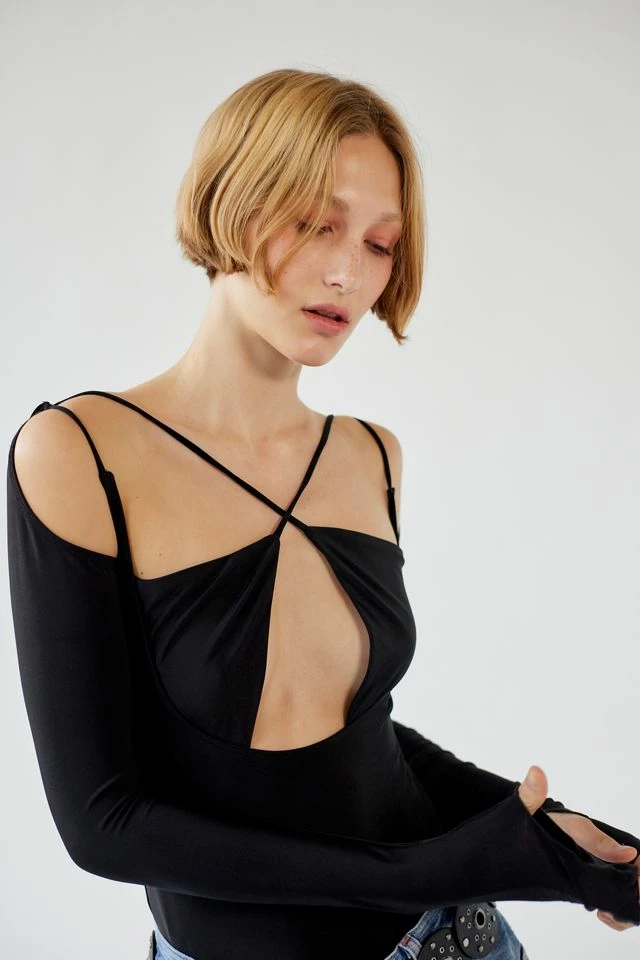 Fall madly in love with this modern bodysuit by Out From Under. Cut in a bodycon fit with strappy details at the plunging neckline and fitted long sleeves that double as fingerless gloves. Complete with crossed straps at the back. Only at UO.
