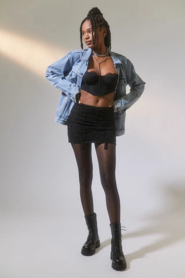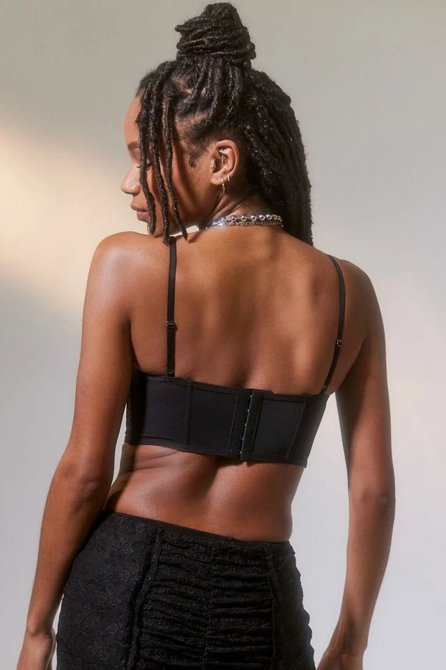 Out From Under’s irresistible Modern Love corset now in a cropped silhouette. Made from a body-hugging stretch fabric with a fitted bodice and underwire cups. Decorated with lace detailing for a romantic finish and topped with adjustable spaghetti straps and hook & eye back closures. UO exclusive.