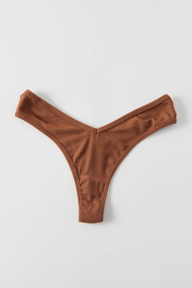 Flattering + comfortable thong from the intimates experts at Out From Under. V-cut front and back in a mid-rise waist with thick, ribbed banding. Perfect for long wear or lounging in bed.