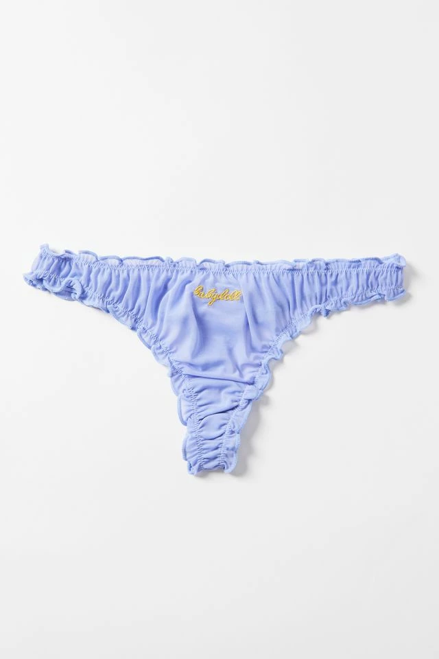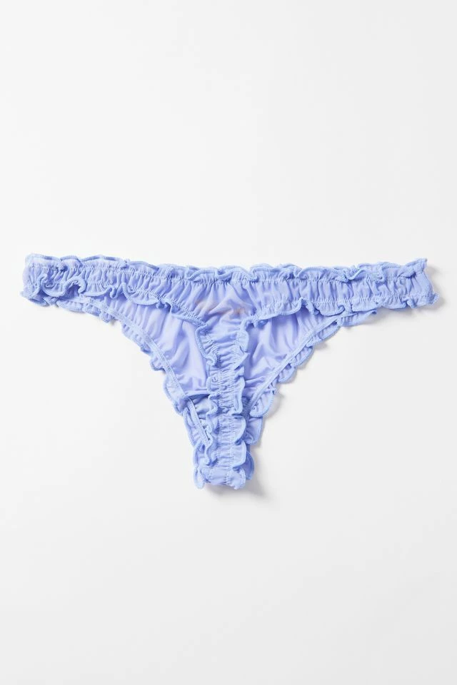 Out From Under thong with lettuce edging and ruching throughout plus an embroidered accent. Construction provides a smooth look, all-day comfort and a fit individualized to you. UO exclusive.