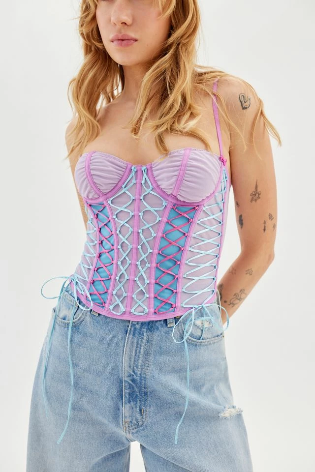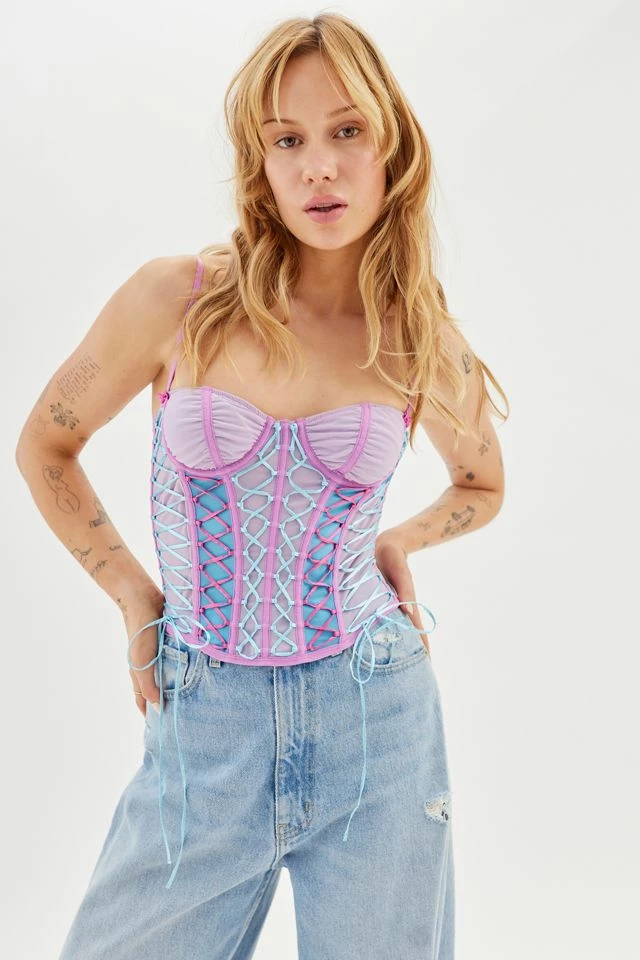 Out From Under corset with ribbons + bow detailing. Cropped silhouette with a sweetheart neckline and underwire cups. Complete with contrasting trim + boning throughout. Only at Urban Outfitters.